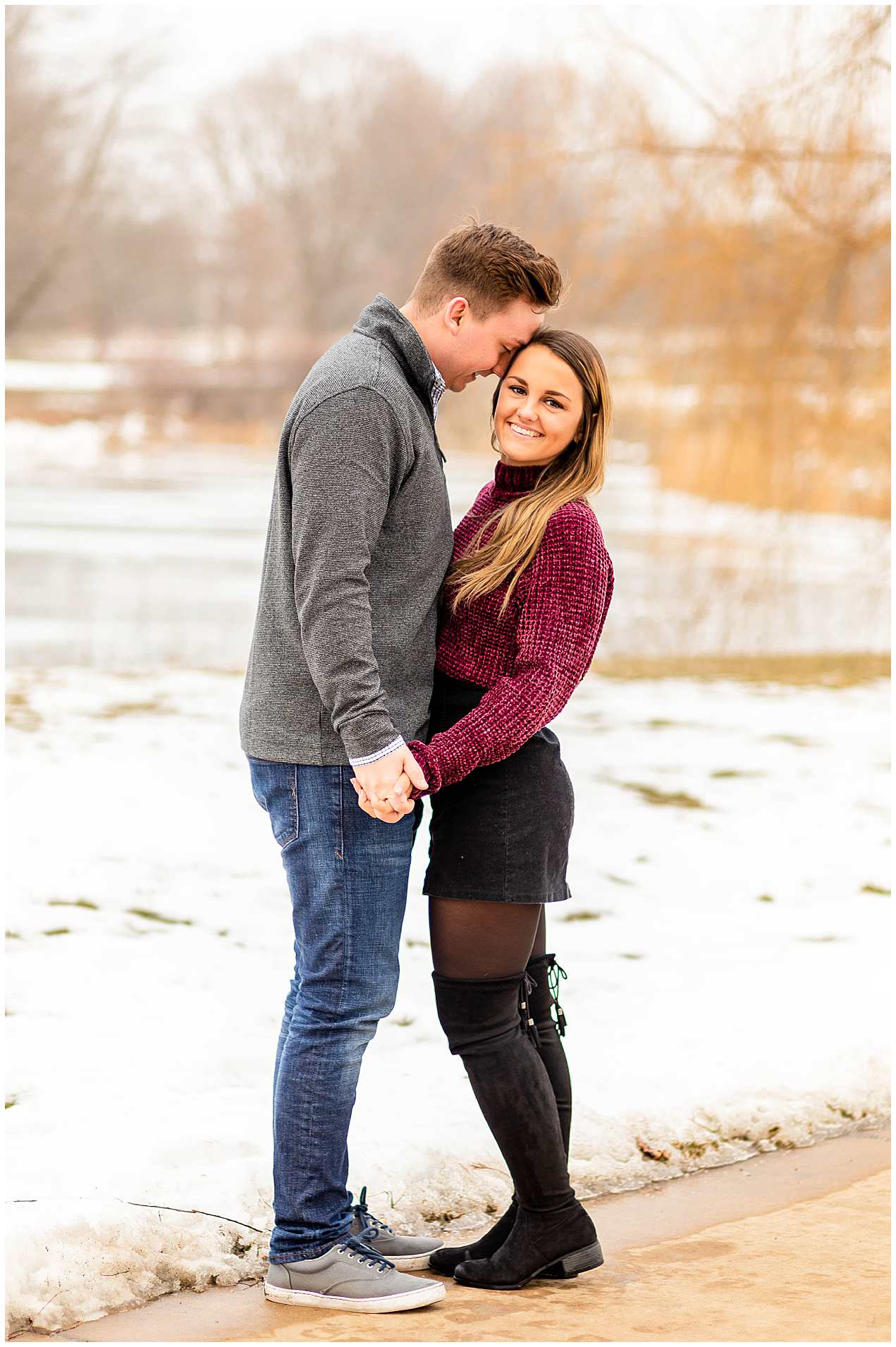 Oh, how I loved meeting and photographing these two & their sweet relationship! Often times, I tell couples that they may feel awkward for the first few minutes of their session and that it’s completely normal. I mean, posing in a public place with your significant other (& often times in front of strangers walking by) doesn’t exactly feel natural to most people. 🙂 These two were such naturals right from the start! They were so so fun to be around, and I couldn’t have had more fun exploring one of my favorite Champaign locations with them! When Kristina sent me a photo of her outfit a couple days before hand, I was so excited because it is the cutest! I’ve said it so many times, and I’ll say it again-I swear, every single one of my couples show up in the cutest outfits ever!