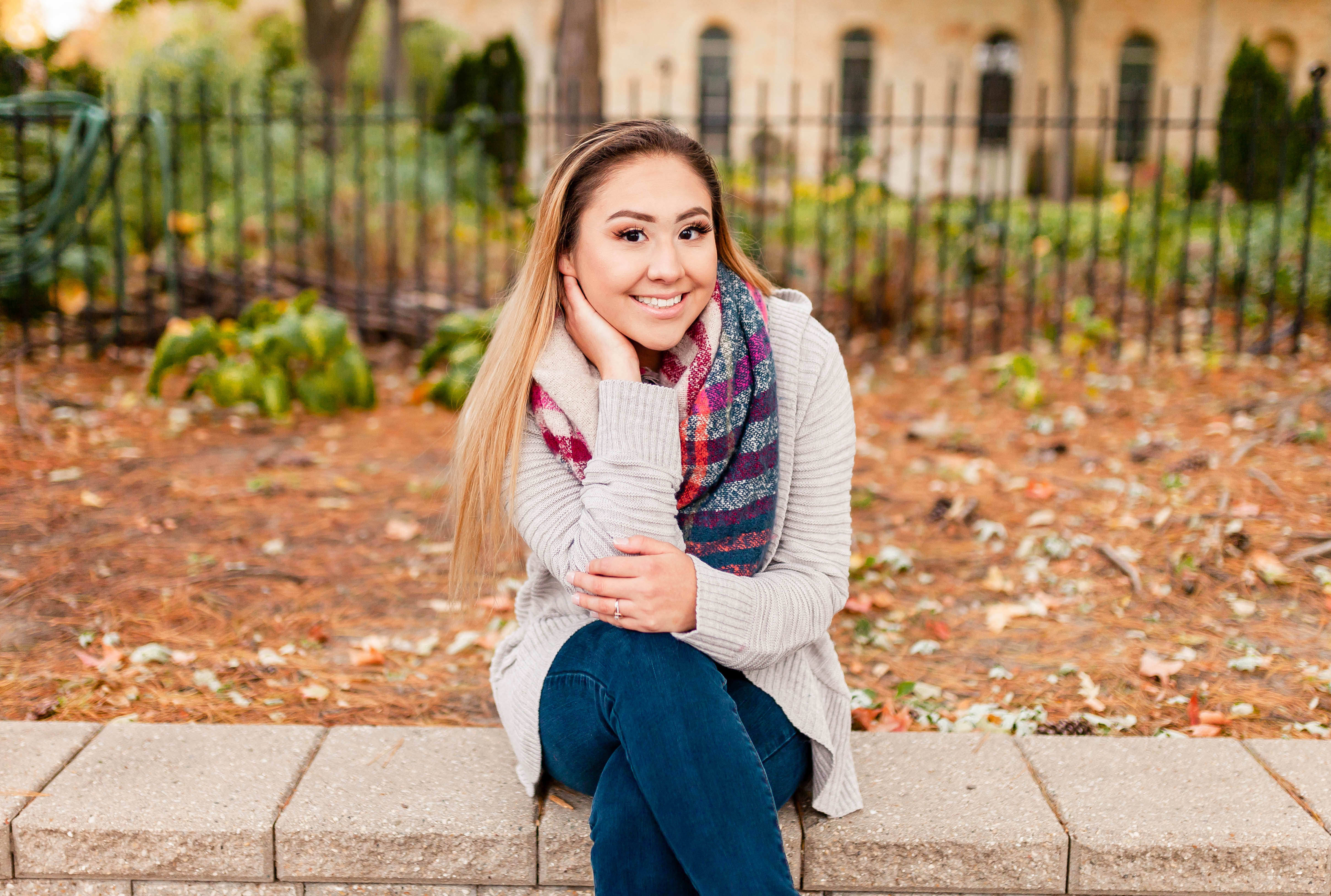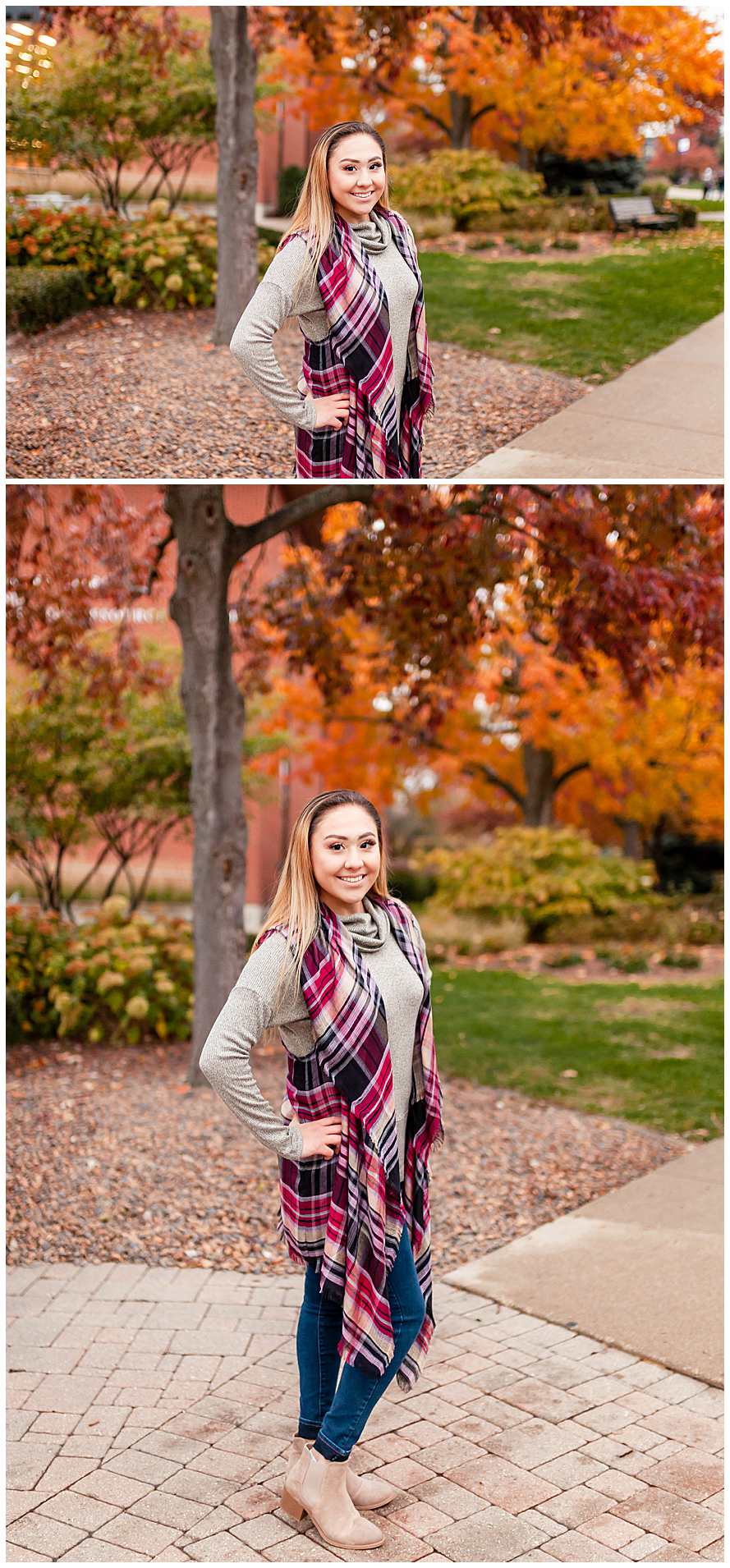 This senior is one of the sweetest ever! For her Fall senior session, I knew that Olivet’s campus would be the perfect location because the trees were that stunning shade of red, the flower bushes were at their peek, and everything about campus screamed “Fall” (which is exactly what she had envisioned)! This girl was full of smiles, and she was a posing pro by the end of her session-with a little posing assistance, it’s so easy to be beautiful and confident in your own skin!! By the way, aren’t her outfits the cutest?! When she showed up in these pretty outfits from Maurice’s, I knew this session was going to be one of my favorites!
