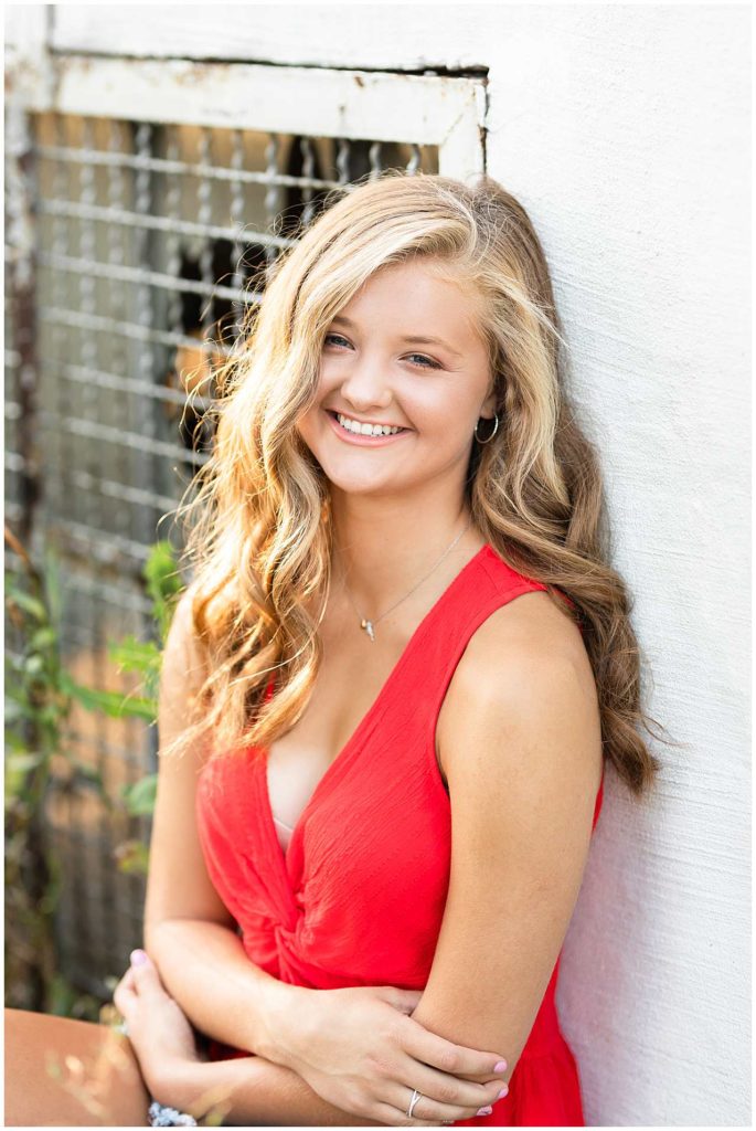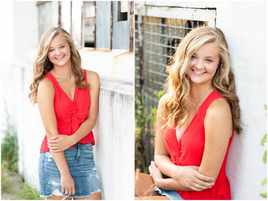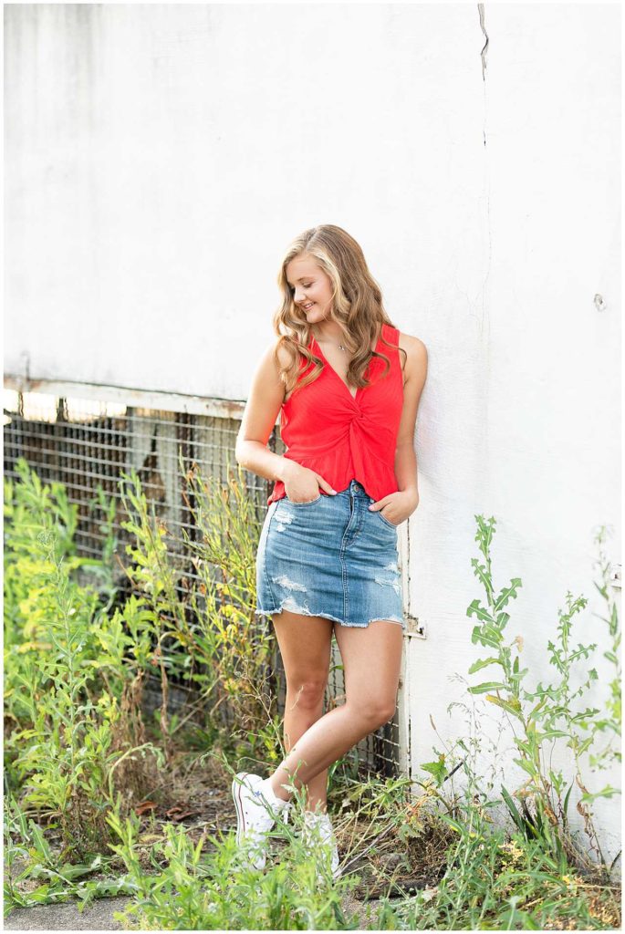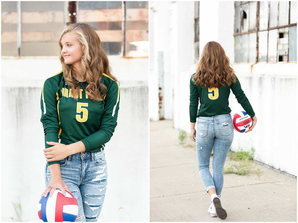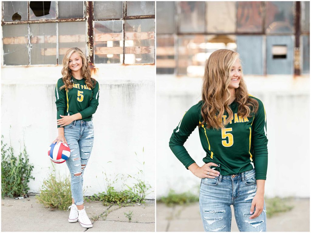We began her session getting her hair + makeup done by my awesome beauty team girls. From there, we headed to this super fun + unique building in downtown Kankakee. This building was absolutely perfect for her volleyball uniform photos and her first outfit. Plus, did I mention that her outfits her amazing-I mean, I couldn’t have handpicked them any better in a million years! They varied in color, patterns, and style & I loved it! She even wrote down all of her outfits and accessory combinations before hand and crossed them off as we changed outfits…best idea ever!!