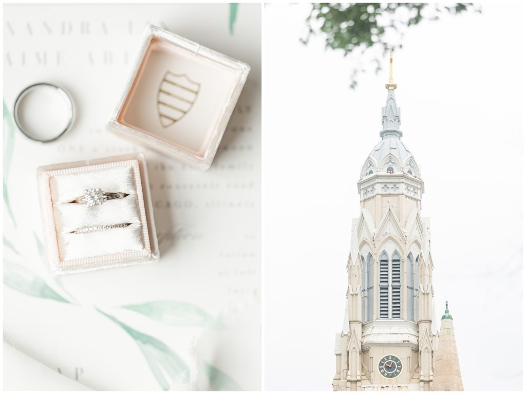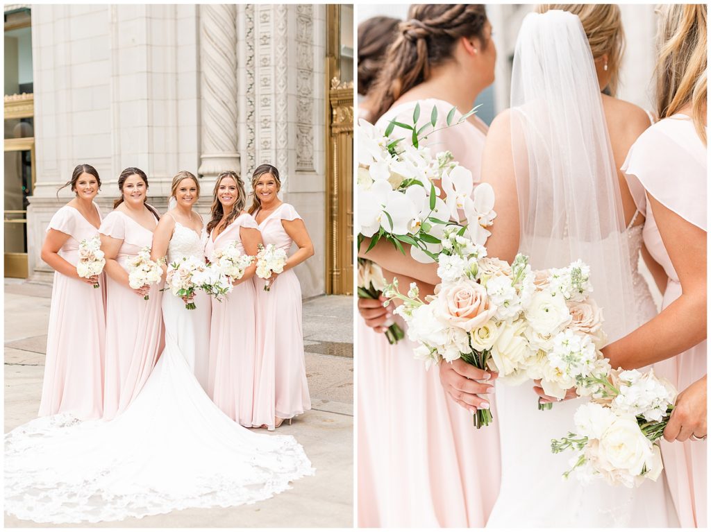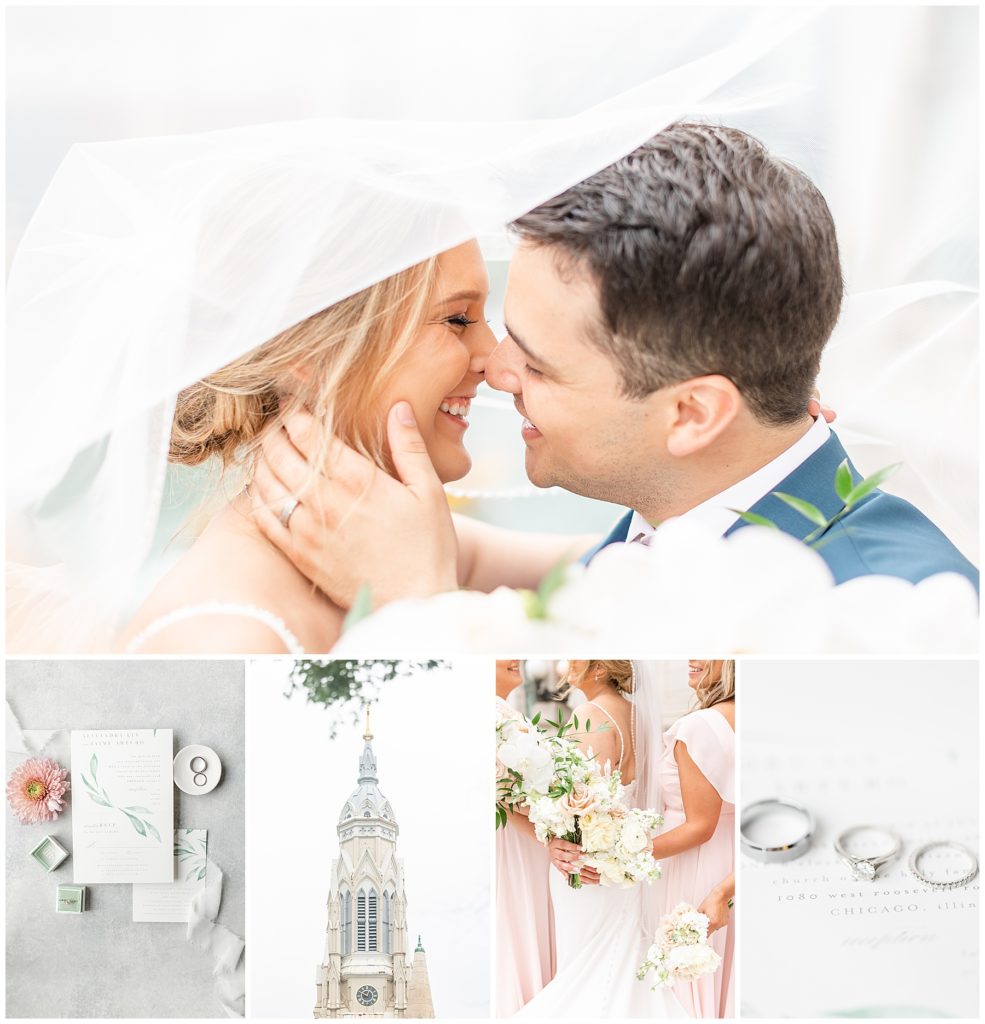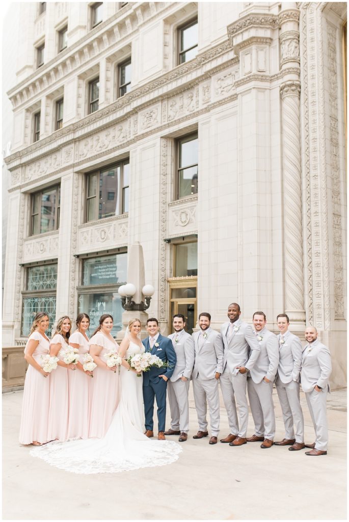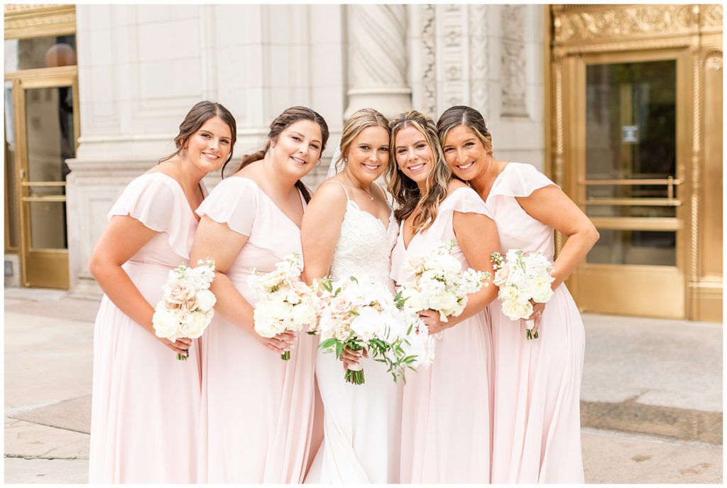 Alix and Jaime’s Chicago wedding day was full of so many of my favorite things-a blush pink color palette, fluffy florals, the most beautiful Chicago photo locations, and the kindest people. We started the day with the guys and girls, separately, while they got ready at the Hyatt House Chicago / West Loop-Fulton Market, and this hotel had amazing natural light for us (always a wedding photographer’s dream!!). After they were both ready, we headed to their ceremony at Church of the Holy Family, which is a stunning Catholic cathedral in Chicago.