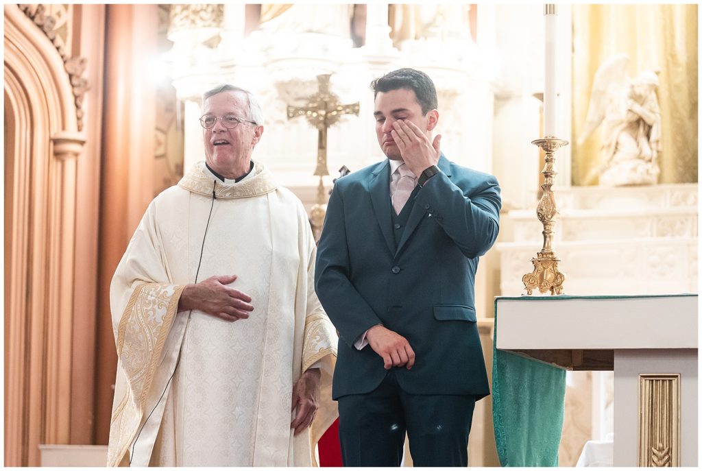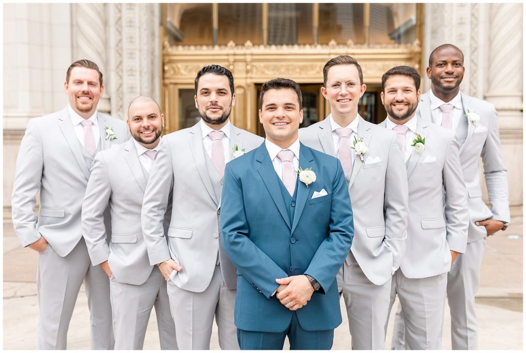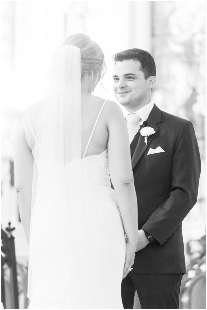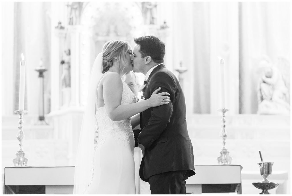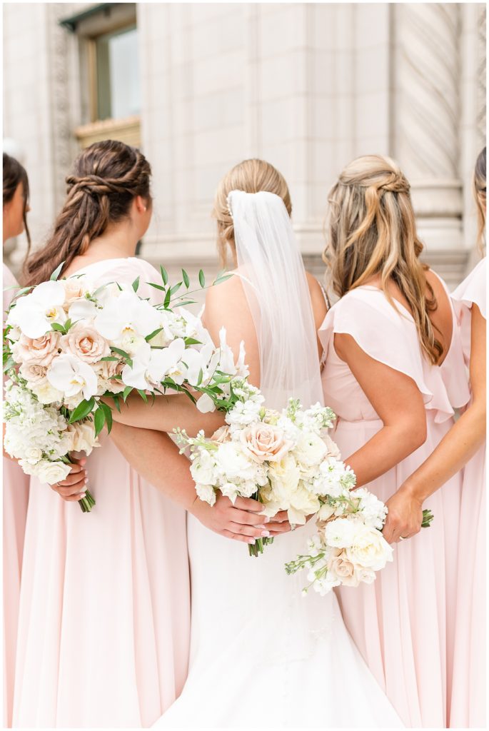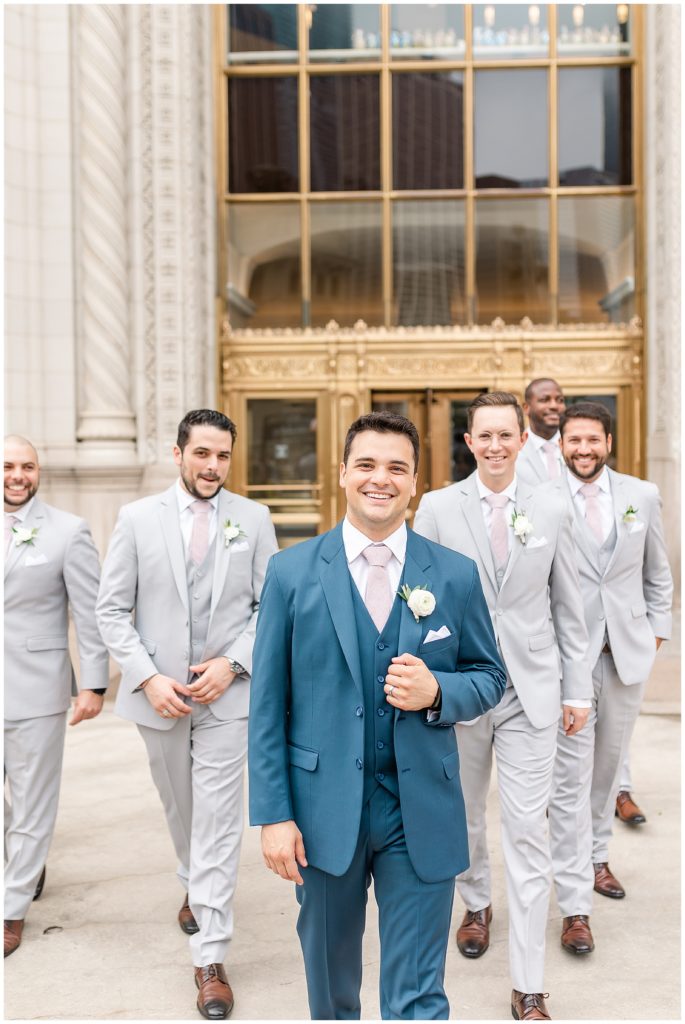 Alix and Jaime’s Chicago wedding day was full of so many of my favorite things-a blush pink color palette, fluffy florals, the most beautiful Chicago photo locations, and the kindest people. We started the day with the guys and girls, separately, while they got ready at the Hyatt House Chicago / West Loop-Fulton Market, and this hotel had amazing natural light for us (always a wedding photographer’s dream!!). After they were both ready, we headed to their ceremony at Church of the Holy Family, which is a stunning Catholic cathedral in Chicago.