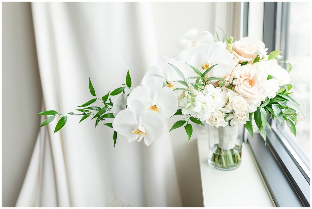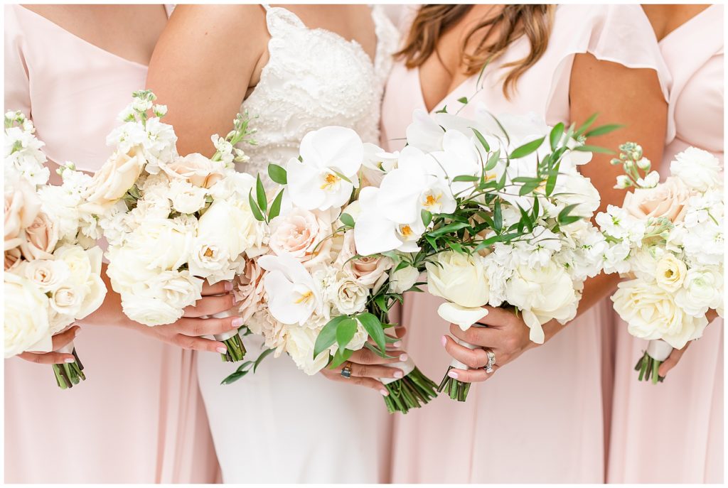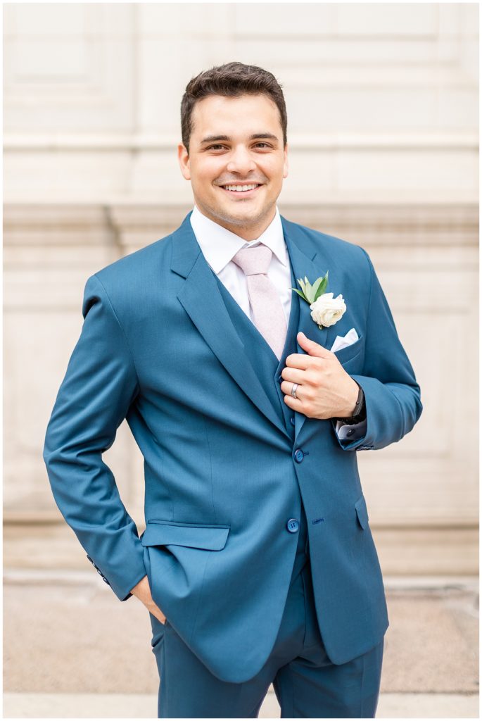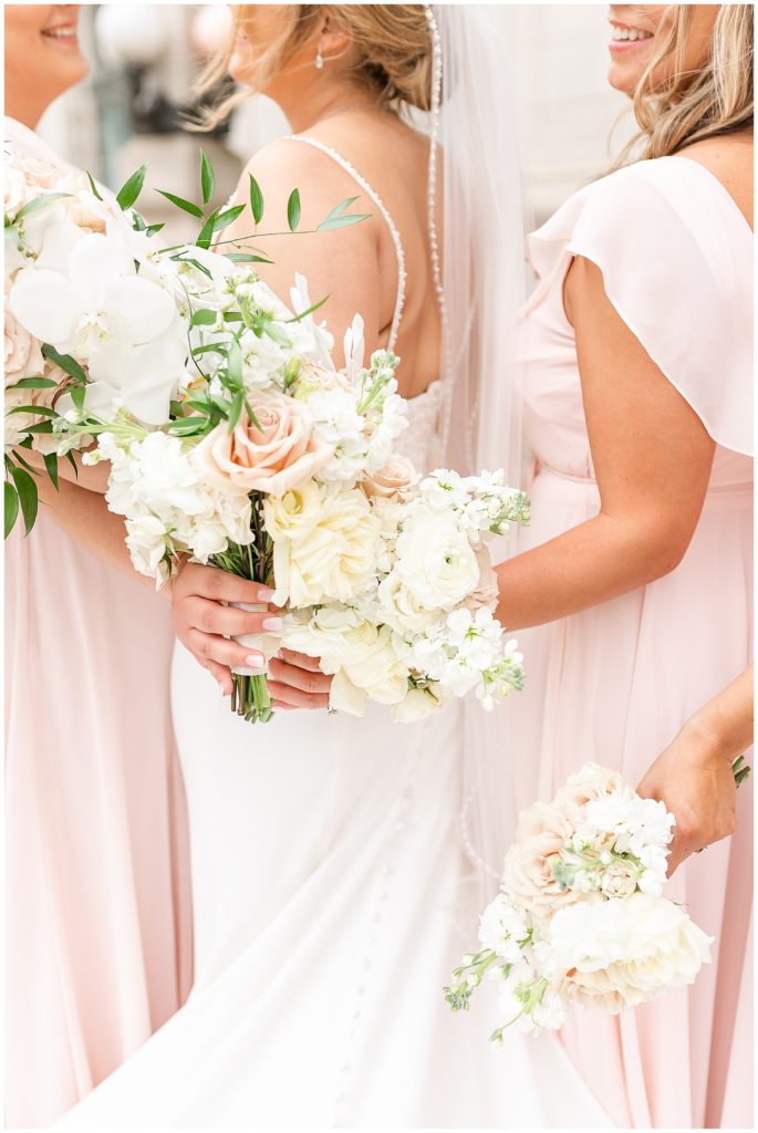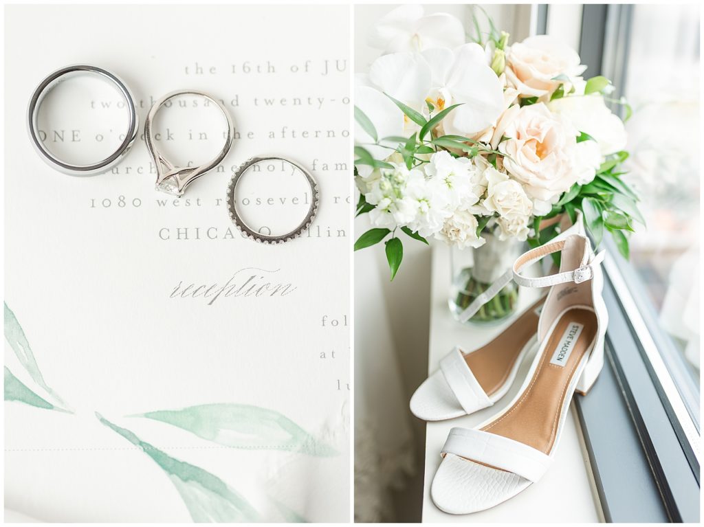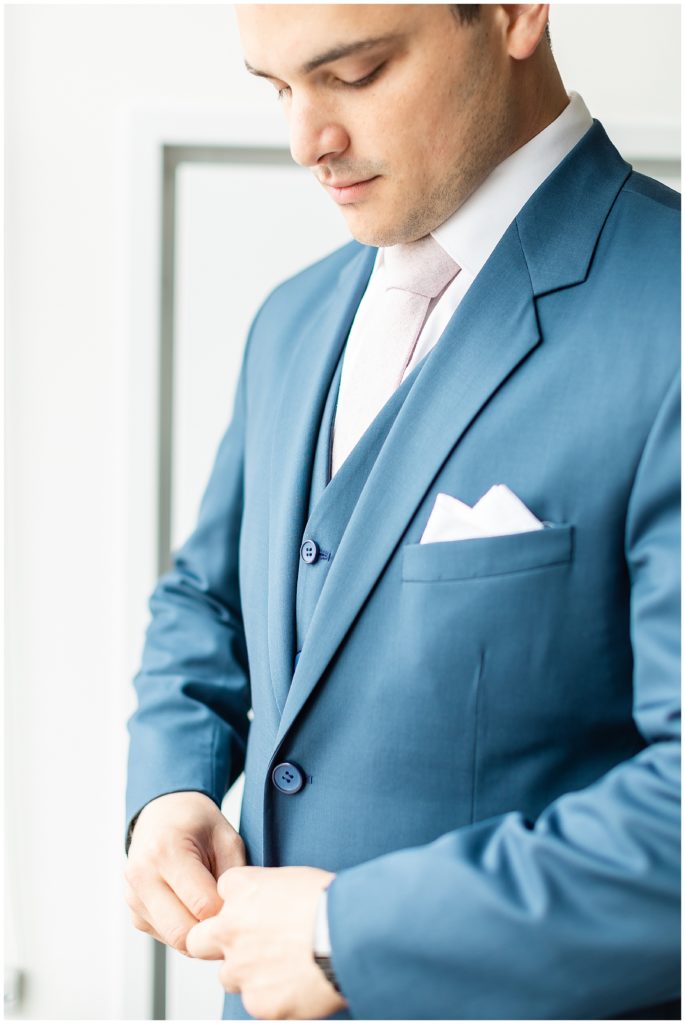 Alix and Jaime’s Chicago wedding day was full of so many of my favorite things-a blush pink color palette, fluffy florals, the most beautiful Chicago photo locations, and the kindest people. We started the day with the guys and girls, separately, while they got ready at the Hyatt House Chicago / West Loop-Fulton Market, and this hotel had amazing natural light for us (always a wedding photographer’s dream!!). After they were both ready, we headed to their ceremony at Church of the Holy Family, which is a stunning Catholic cathedral in Chicago.