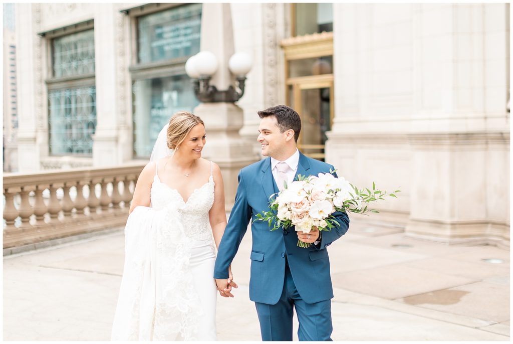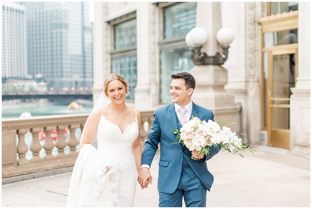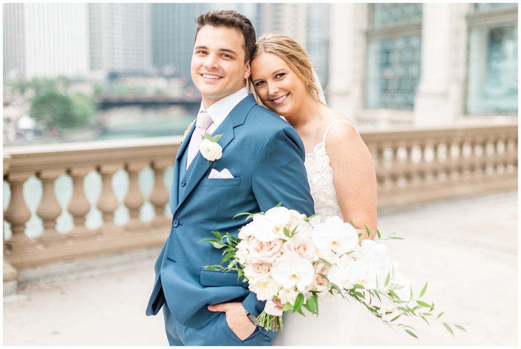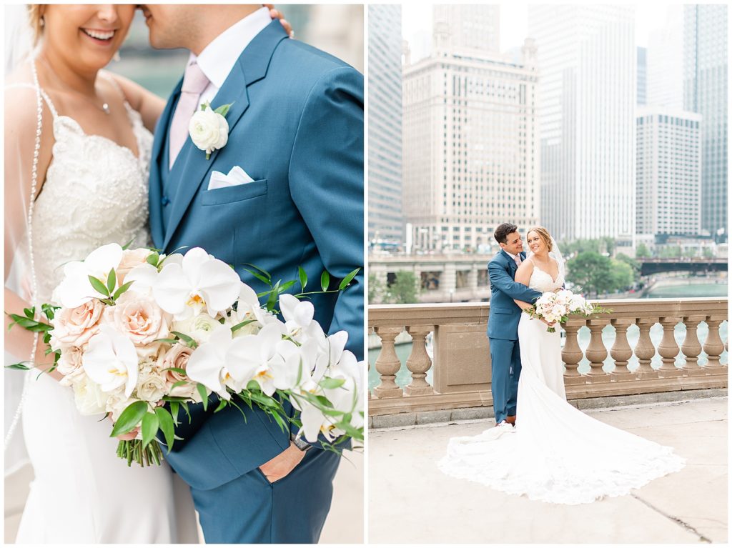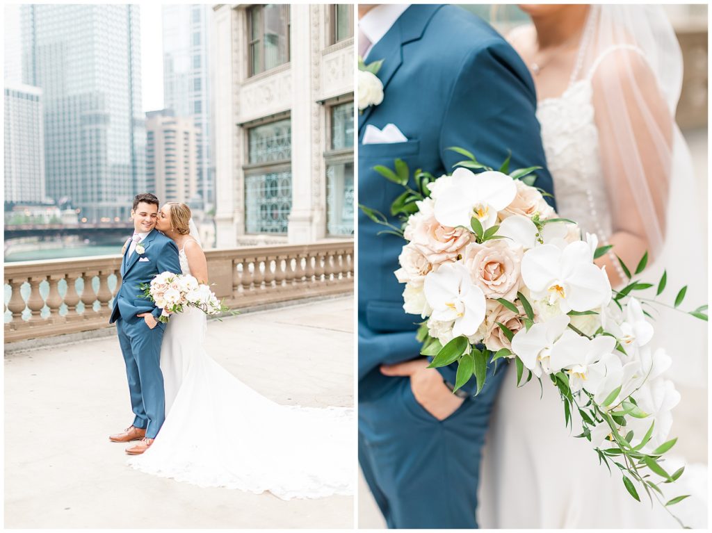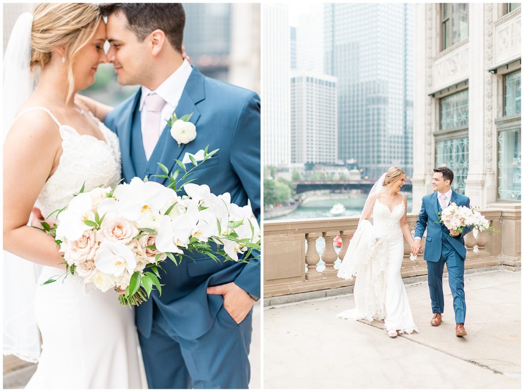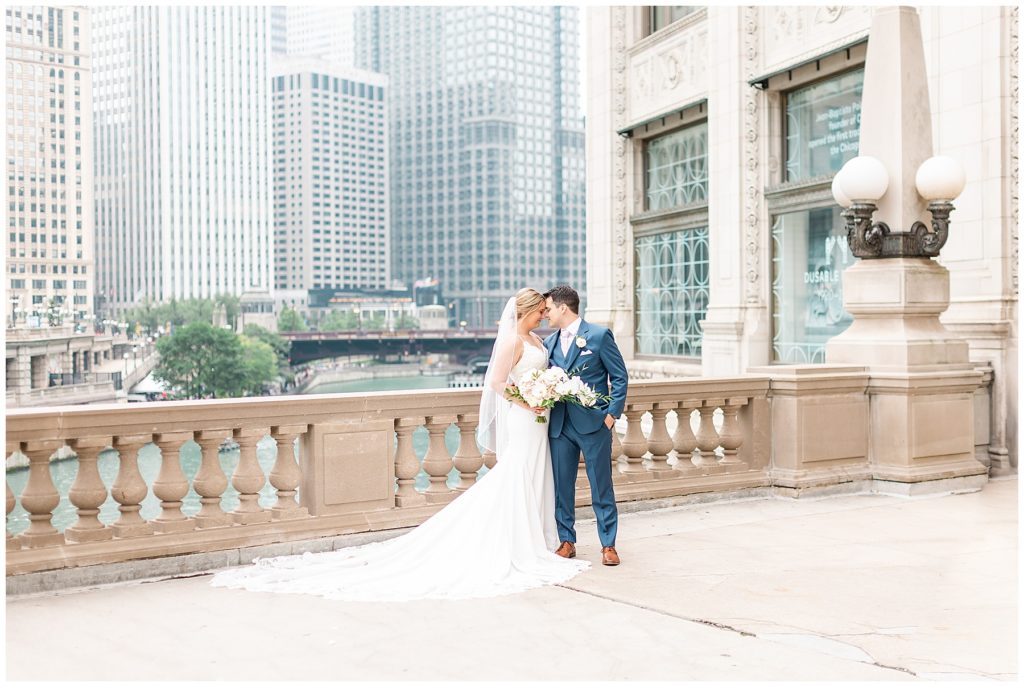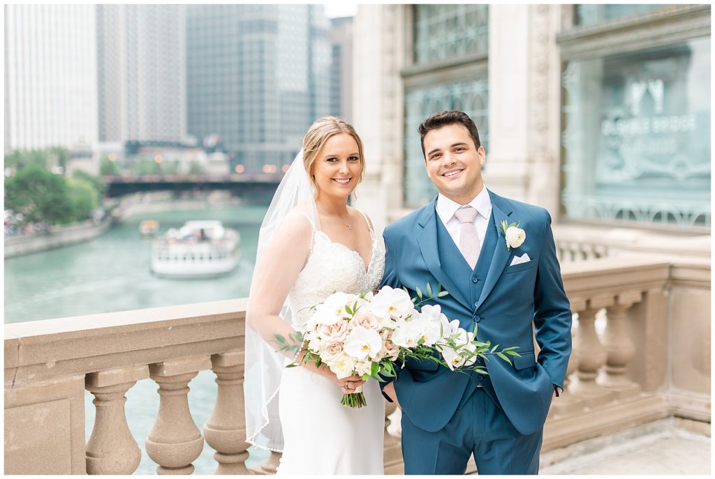 For portraits, we ended up at one of my absolute favorite downtown Chicago locations- The Wrigley Building. This location is perfect for a classy, elegant couple with neutral backgrounds and a glimpse of the river 🙂 I just love it!!