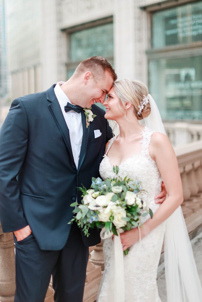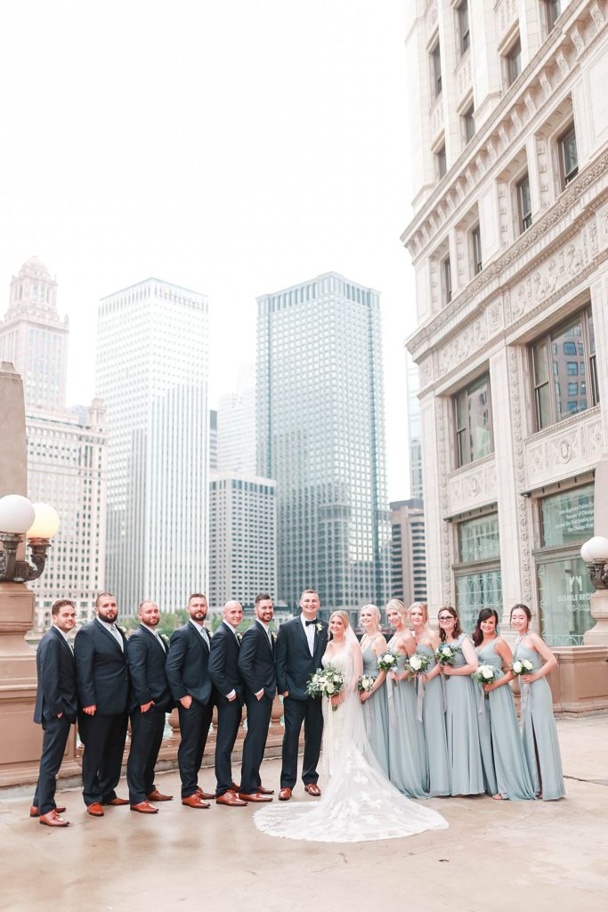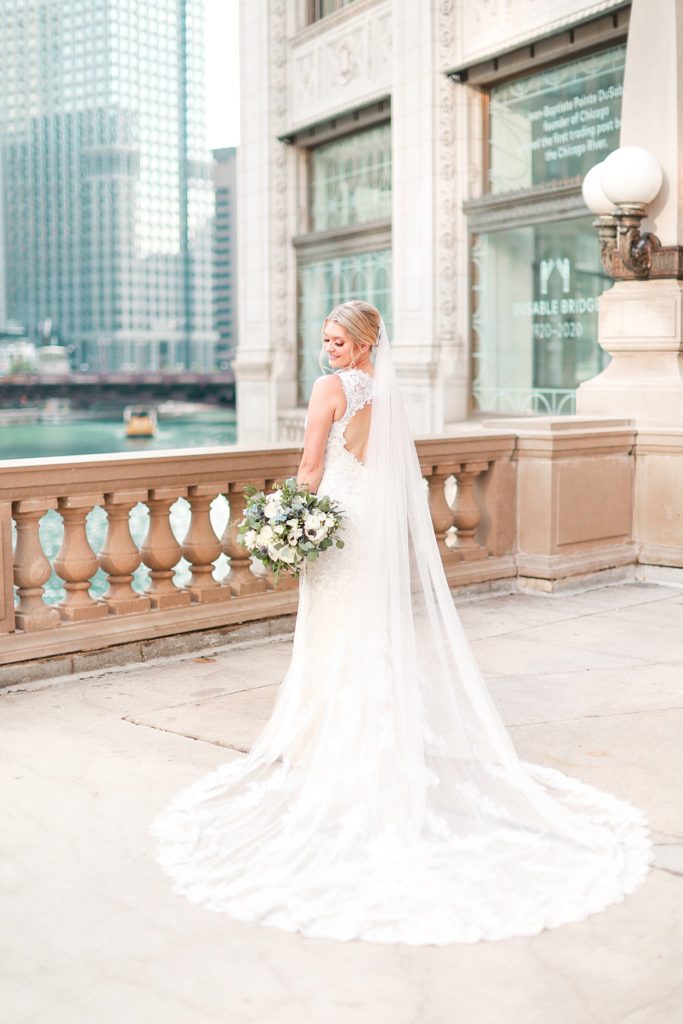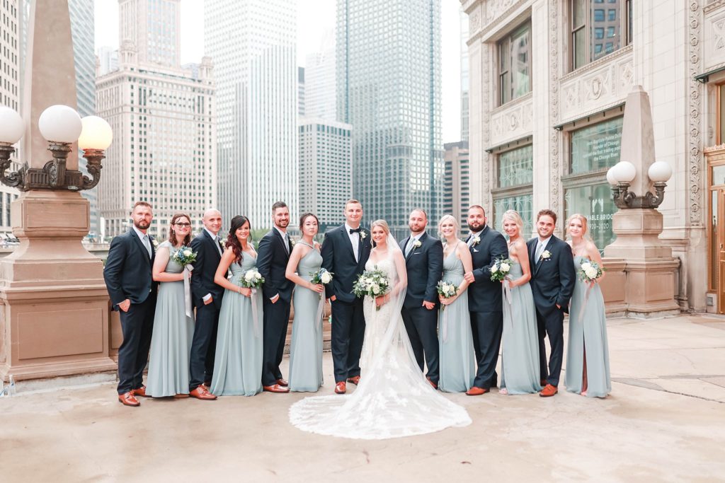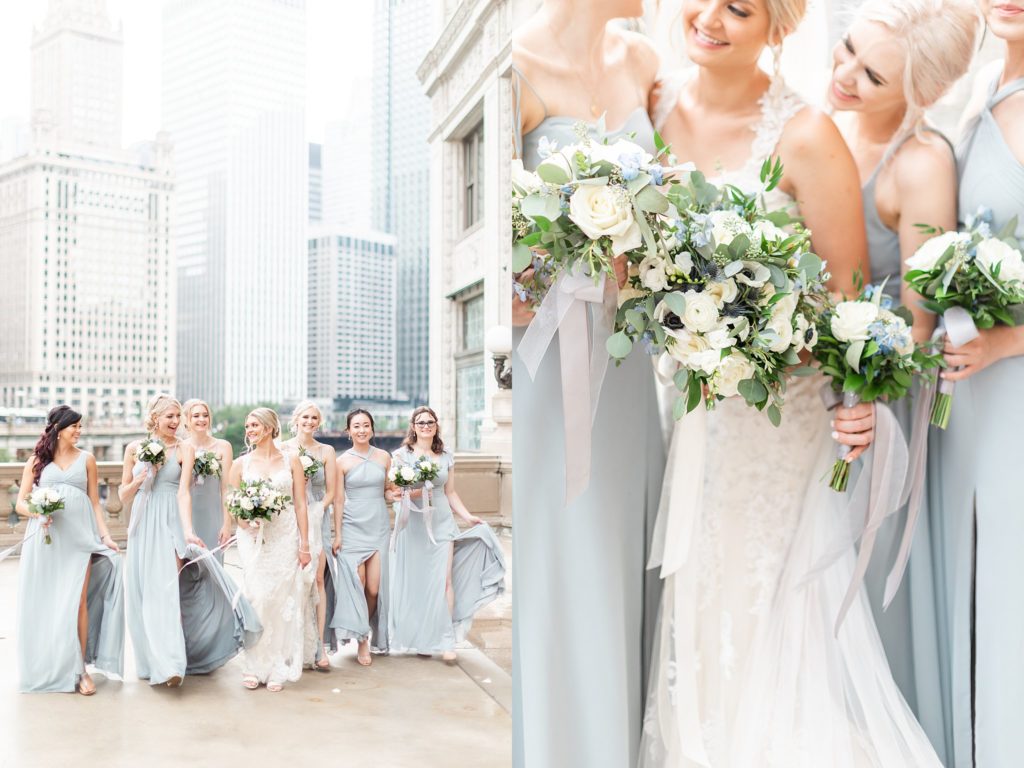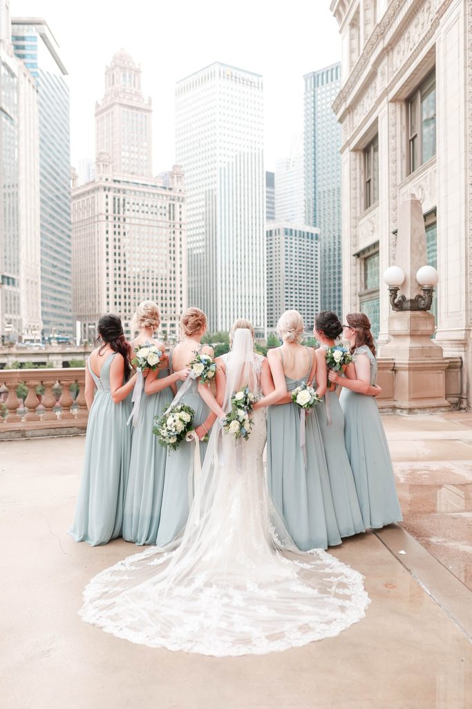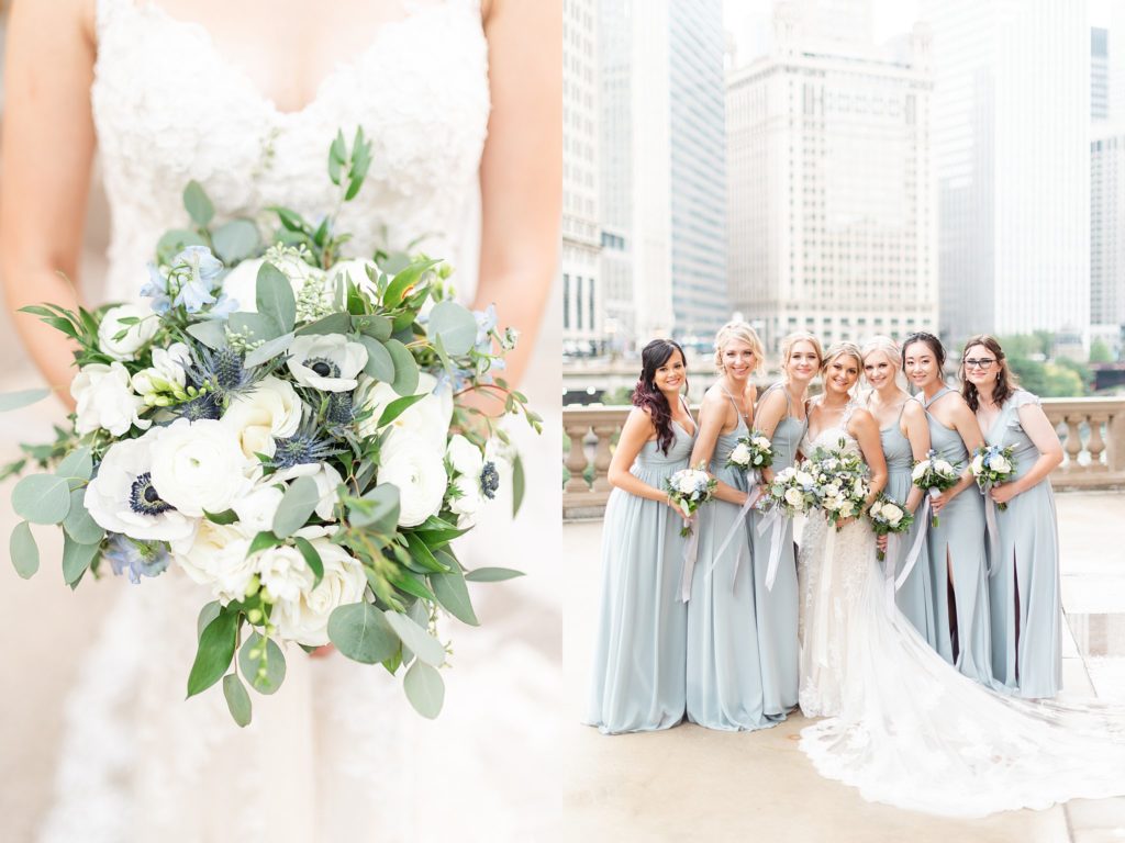 Hearing all about Lauren’s dream wedding had excited every time we got to chat! The dusty blue & navy color palette, dreamy, garden inspired florals, and pure elegant touch of downtown Chicago portraits made for a picture-perfect wedding day that I am just obsessed with! If you’ve looked through my blog posts before, you probably recognize this portrait location, the Wrigley Building. This location is a super popular one for Chicago wedding photographers, and I’m totally included in that-I love it!