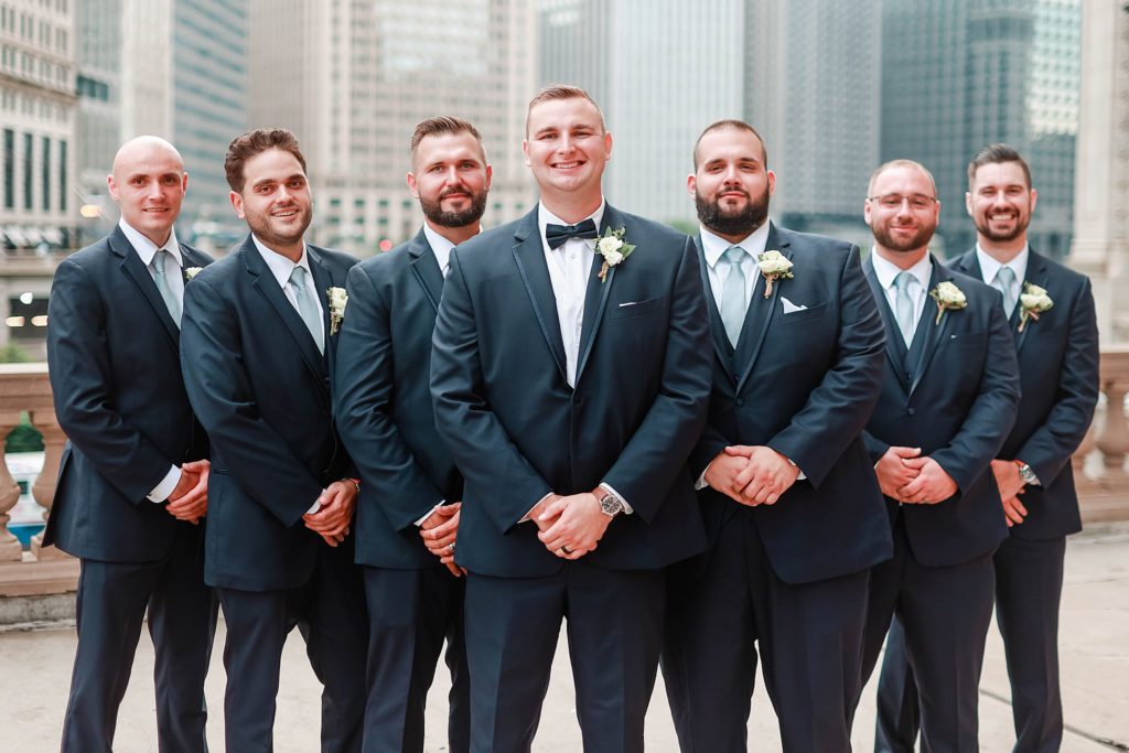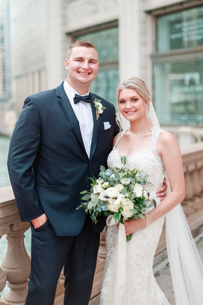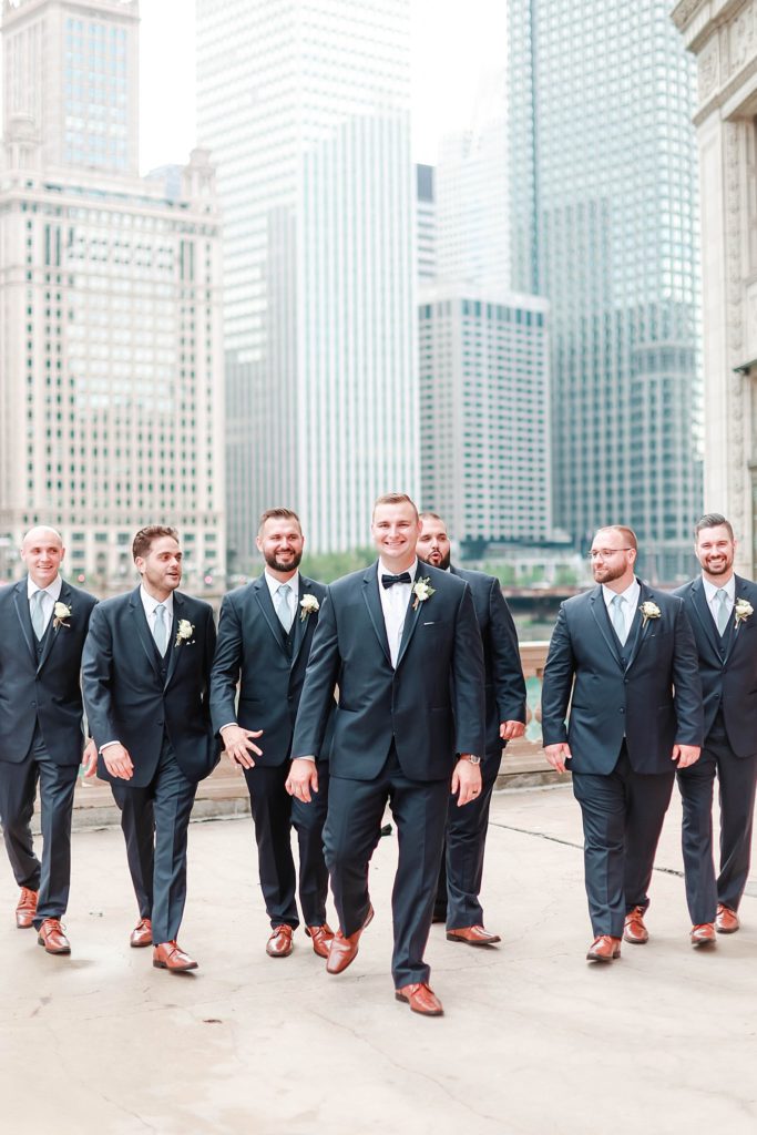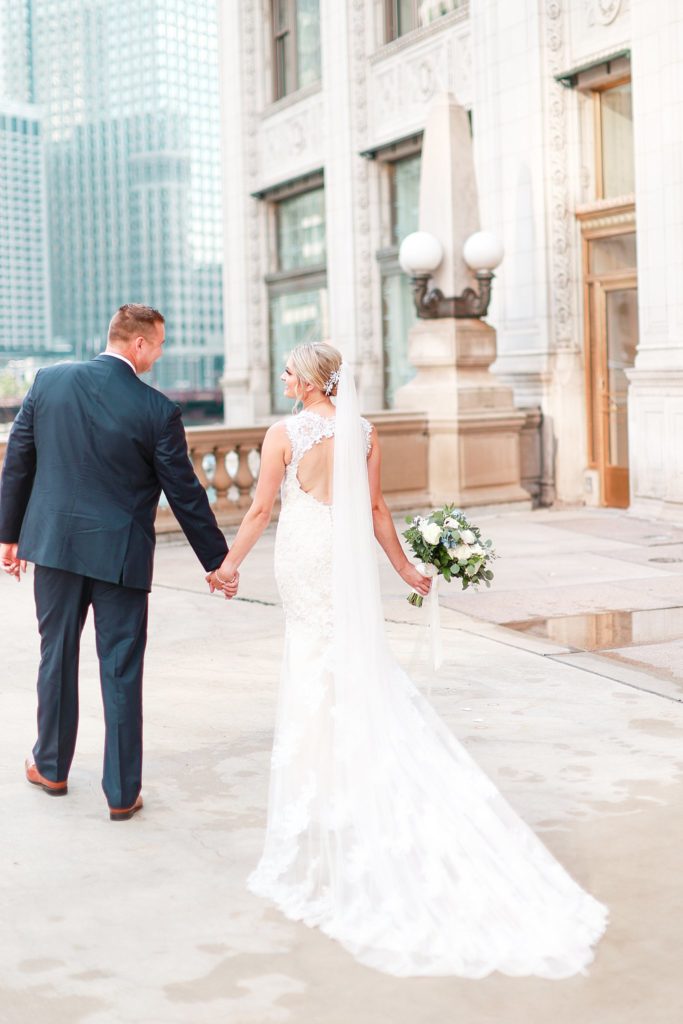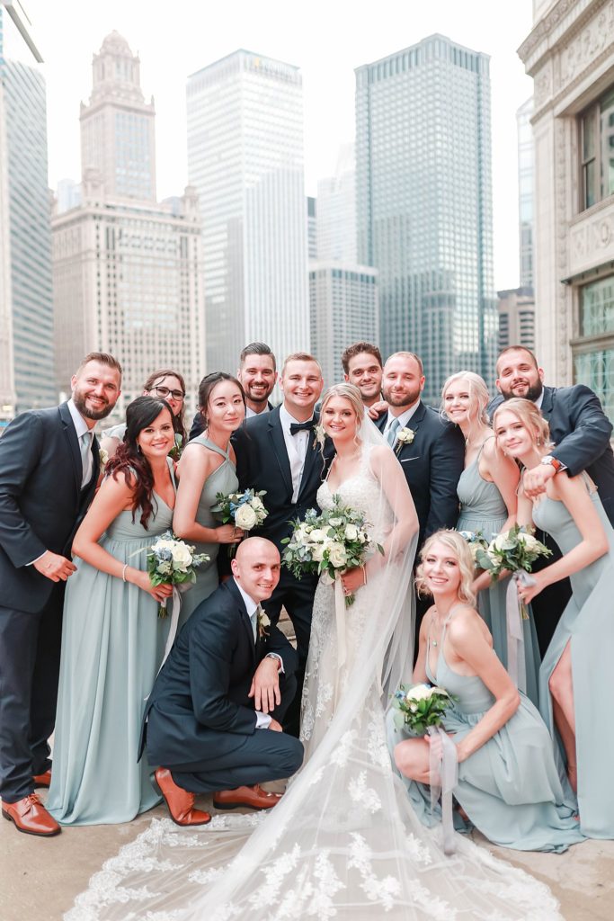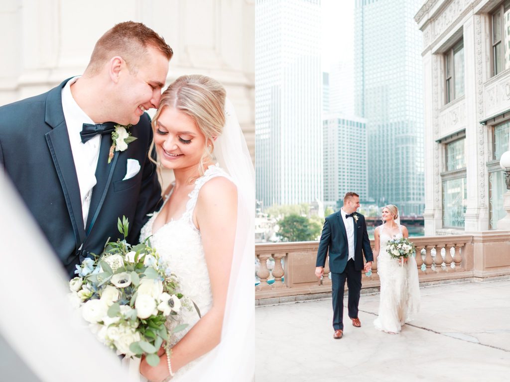 Hearing all about Lauren’s dream wedding had excited every time we got to chat! The dusty blue & navy color palette, dreamy, garden inspired florals, and pure elegant touch of downtown Chicago portraits made for a picture-perfect wedding day that I am just obsessed with! If you’ve looked through my blog posts before, you probably recognize this portrait location, the Wrigley Building. This location is a super popular one for Chicago wedding photographers, and I’m totally included in that-I love it!