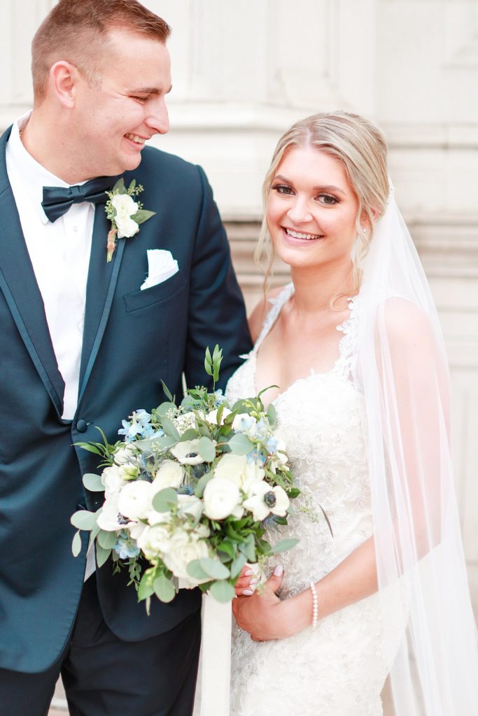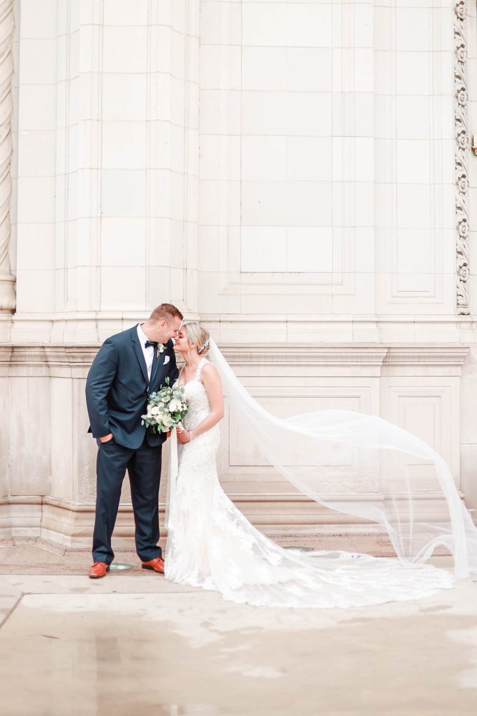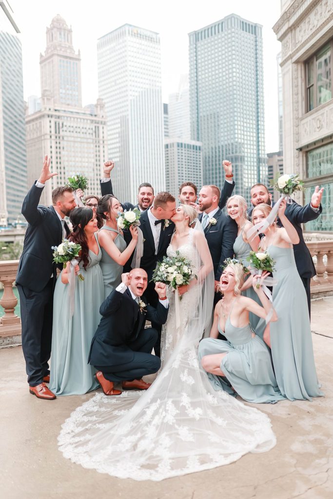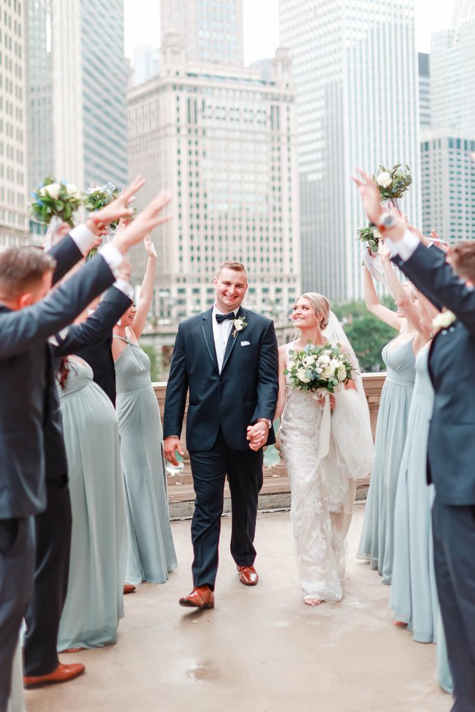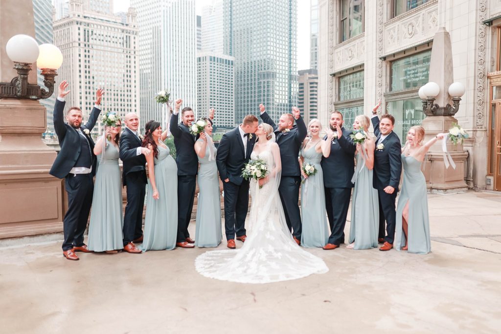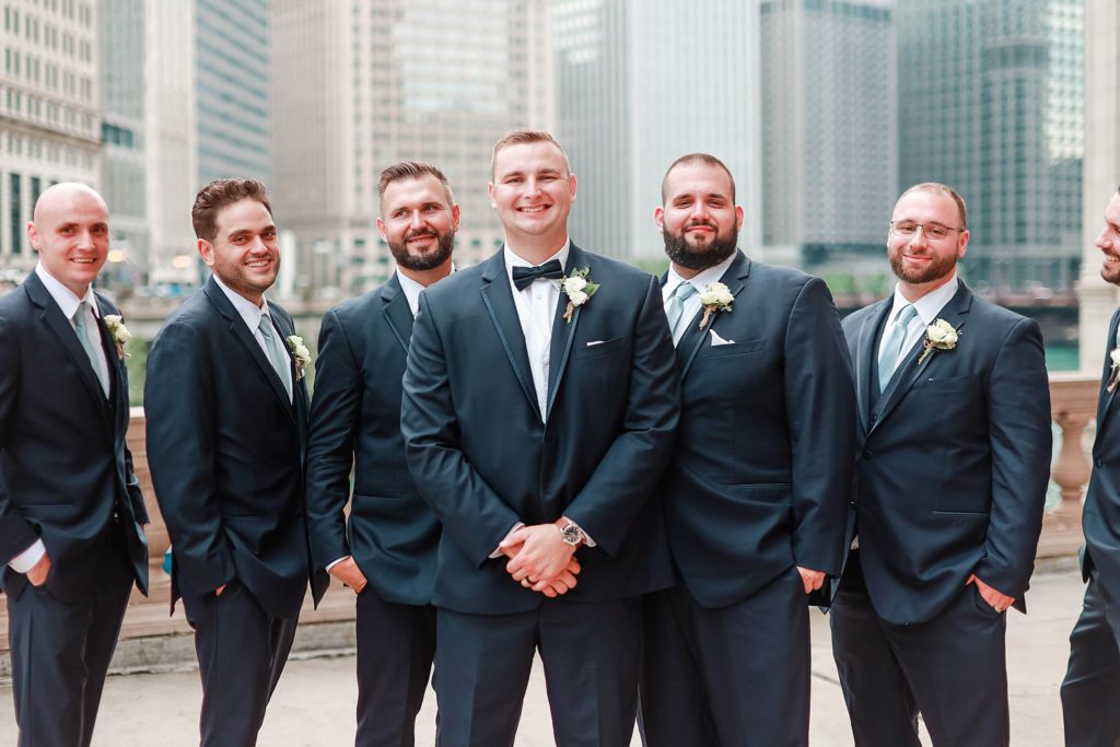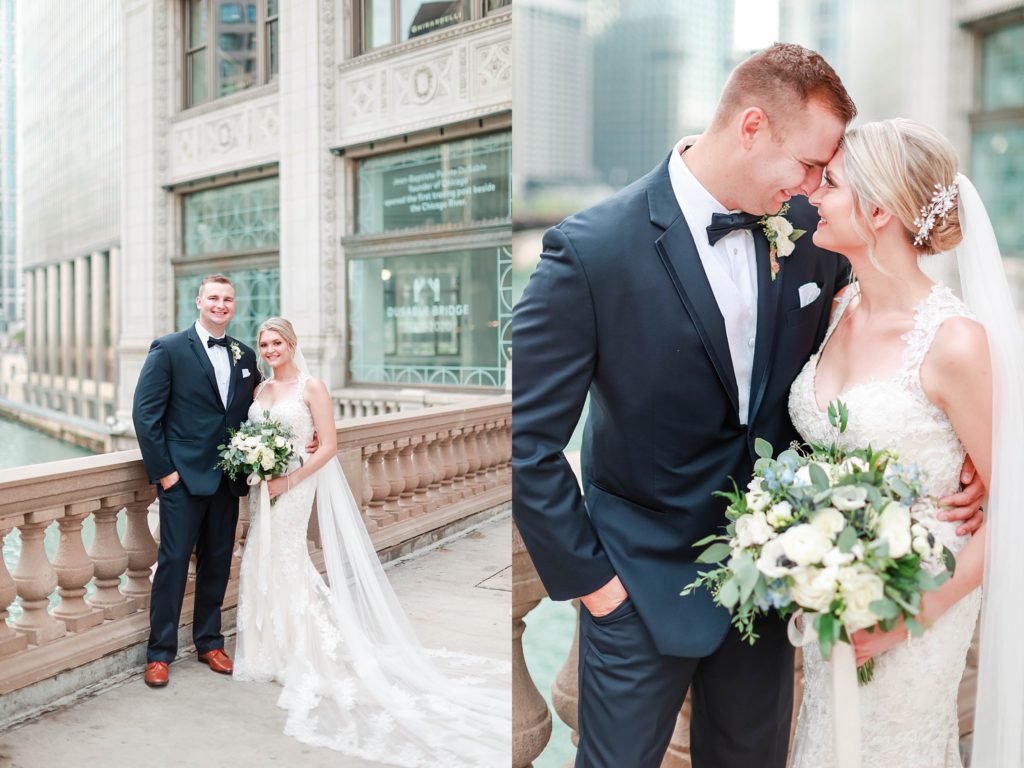 Hearing all about Lauren’s dream wedding had excited every time we got to chat! The dusty blue & navy color palette, dreamy, garden inspired florals, and pure elegant touch of downtown Chicago portraits made for a picture-perfect wedding day that I am just obsessed with! If you’ve looked through my blog posts before, you probably recognize this portrait location, the Wrigley Building. This location is a super popular one for Chicago wedding photographers, and I’m totally included in that-I love it!