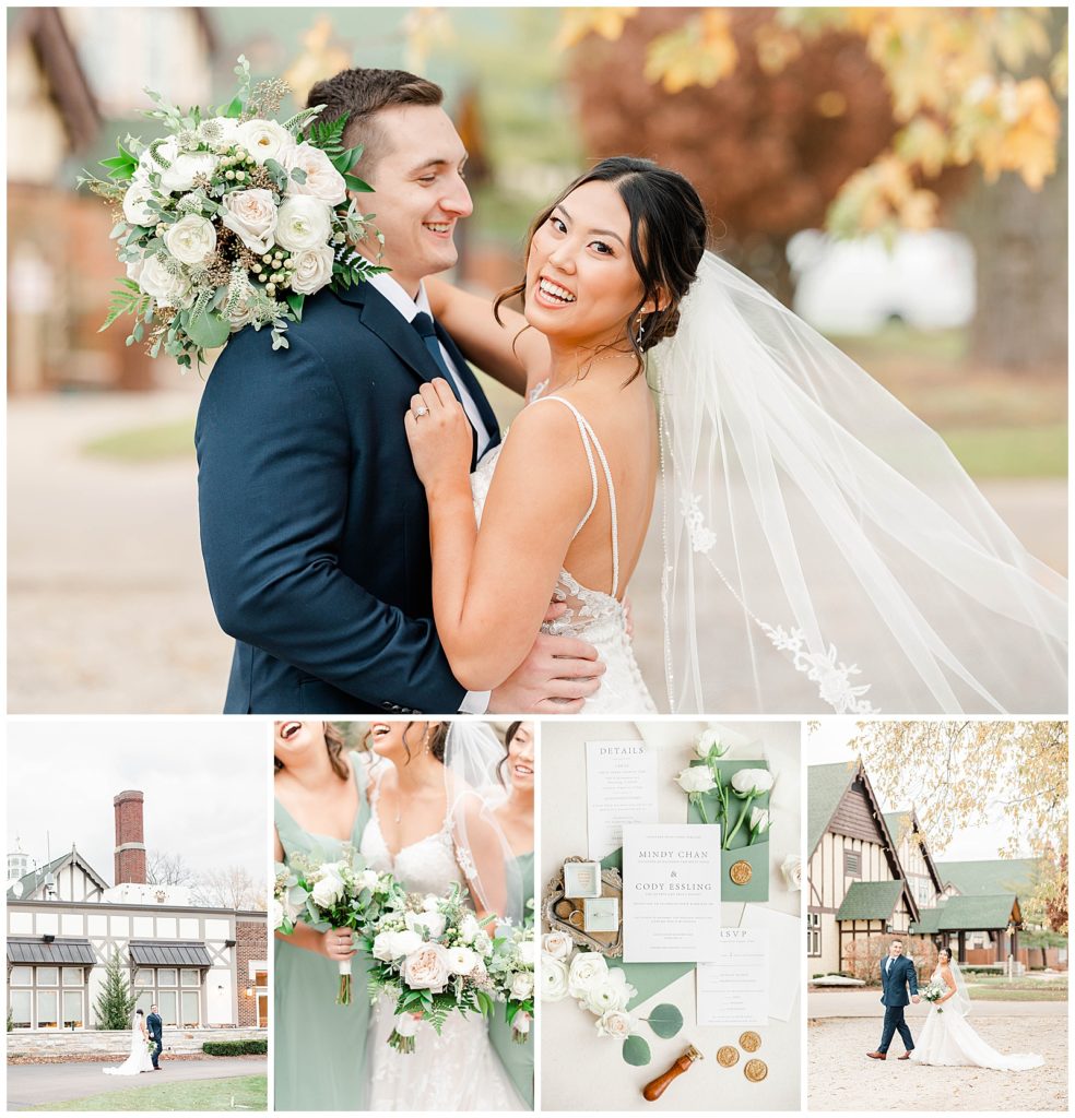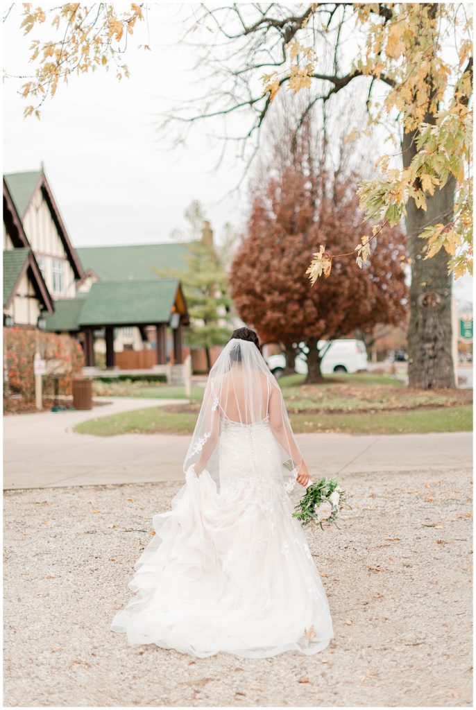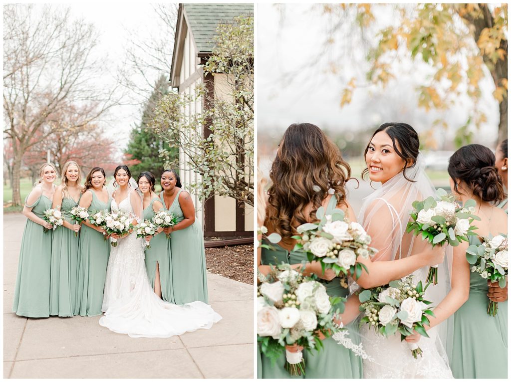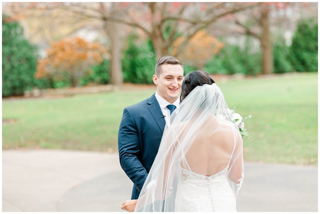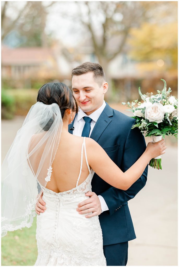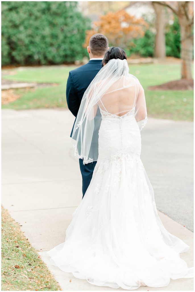 Chevy Chase Country Club is a frequent Chicago suburbs wedding venue that we get the privelage of working at. It’s a beautiful, well light space on its own, but seeing out couples elevate the space into an elegant, pastel colored room is so fun to witness! Somehow, we managed to find a handful of fall-colored trees on the venue grounds, and they worked so beautifully for Mindy and Cody’s wedding portraits.