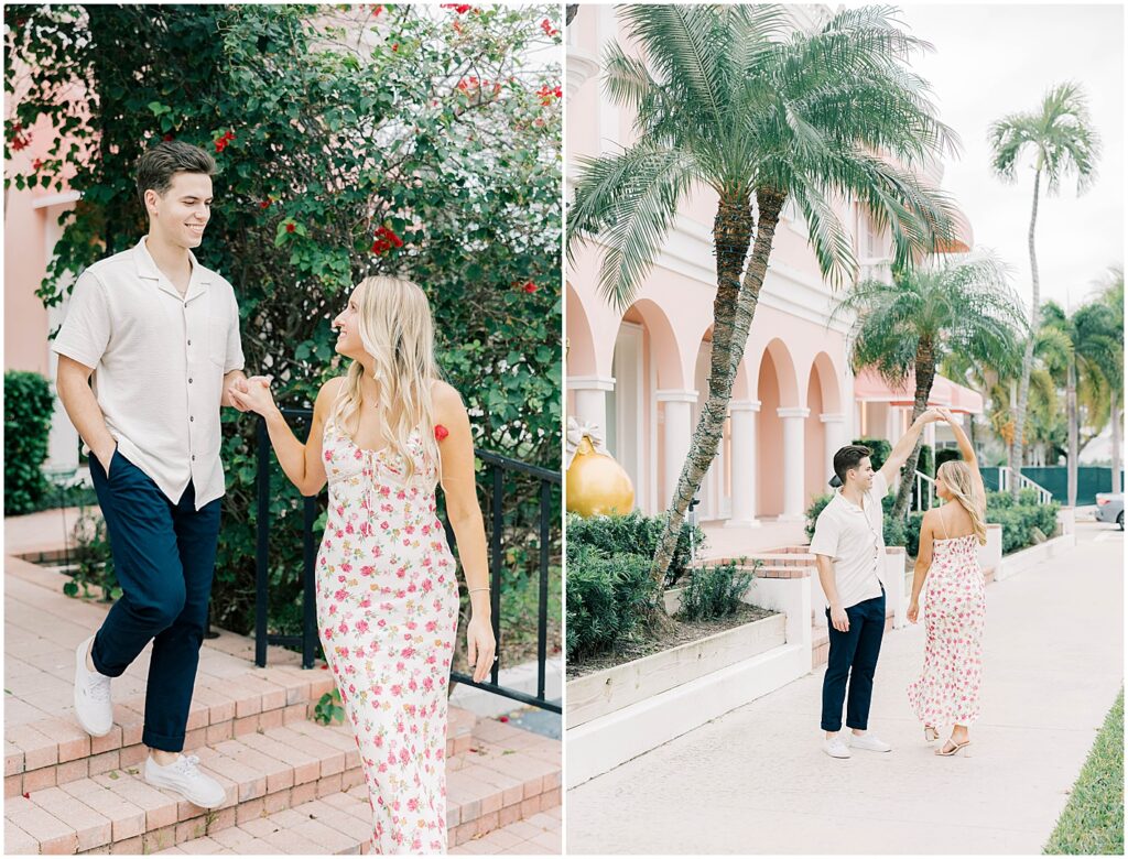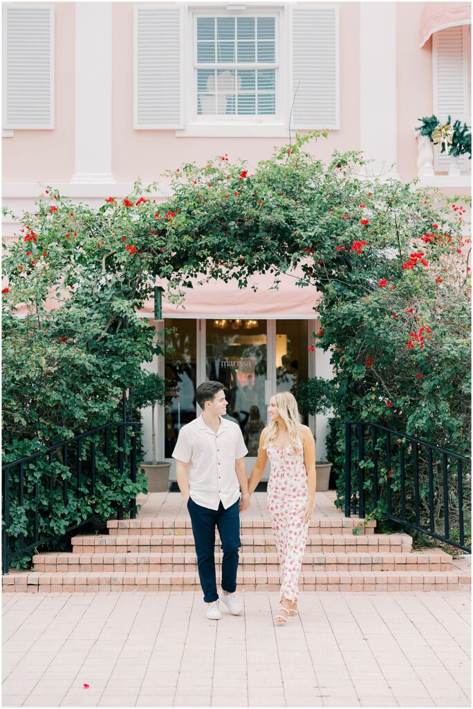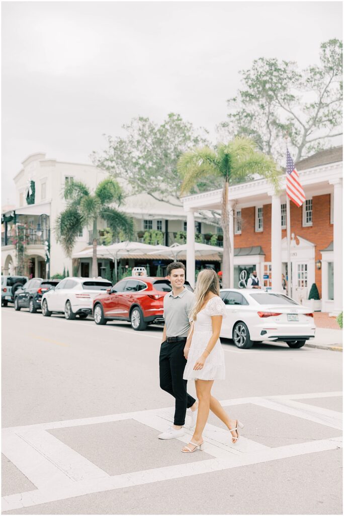 We started the evening in downtown Naples, wandering along Third Street South. Karly wore a soft, flowing white dress that caught the light just right, while Cam kept it classic in a linen button-down and relaxed khakis. The two of them fit right into the elegant, tropical vibe of Naples—laughing together as they strolled past colorful storefronts and pausing for a quick kisses on our walk to the beach.