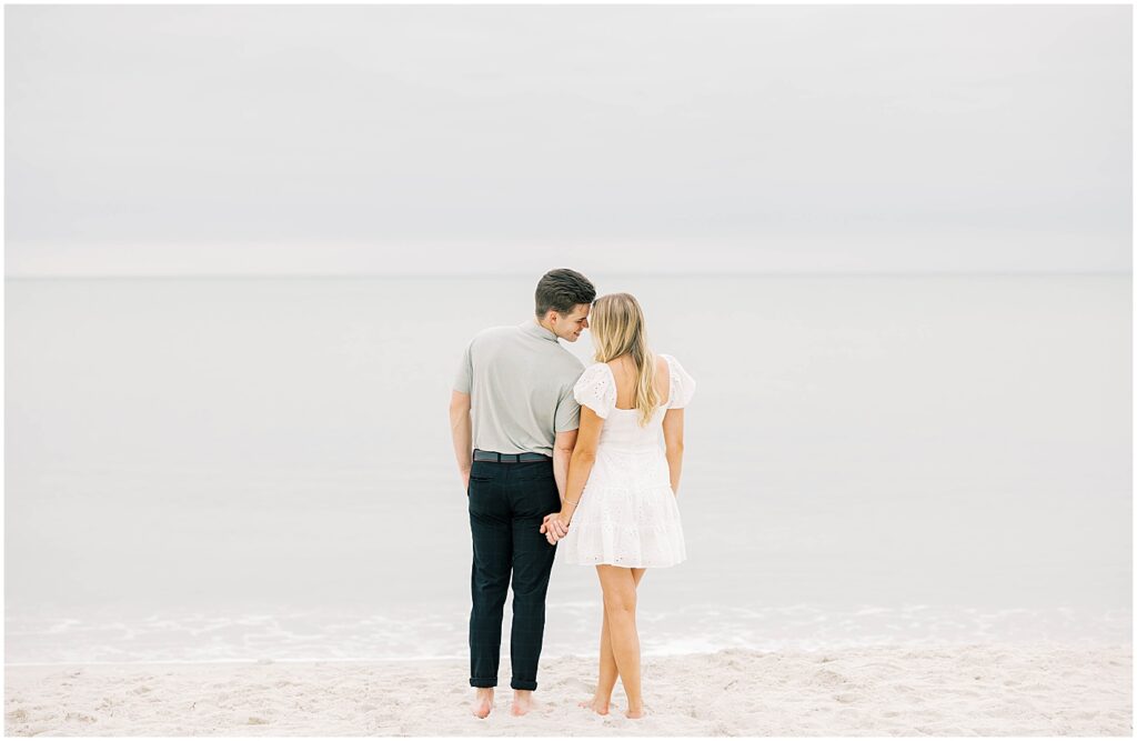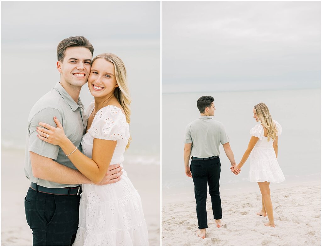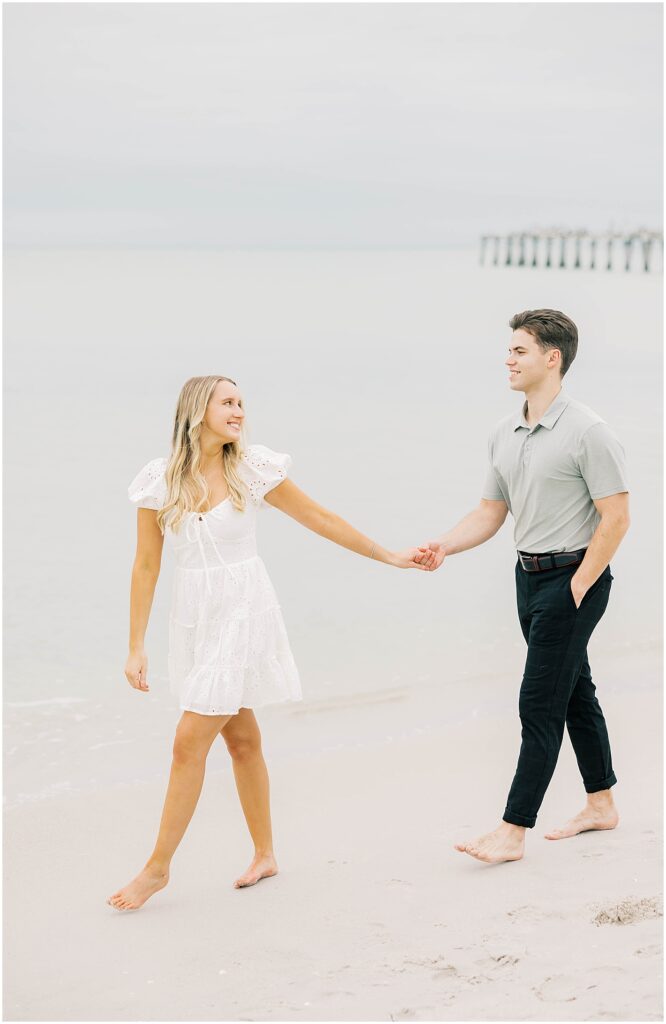 As the sun dipped lower, we made our way to Naples Beach for the second half of their session. Karly kicked off her sandals, and they walked barefoot along the shoreline, waves gently rolling in at their feet.